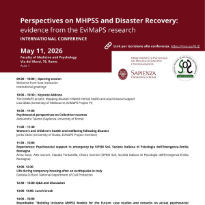 SIPEM SoS Emilia Romagna e Università degli Studi di Roma “La Sapienza” organizzano il convegno internazionale “Perspectives on MHPSS and Disaster Recovery: evidence from the EviMaPS research”, che si terrà l’11 maggio 2026 a Roma.