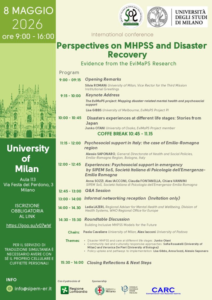 Dopo il primo appuntamento, il convegno internazionale “Perspectives on MHPSS and Disaster Recovery. Evidence from the EviMaPS Research” viene proposto in una seconda data a Milano. In questo modo, l’iniziativa consolida il proprio ruolo come momento di riferimento scientifico e istituzionale nel campo della psicologia dell’emergenza e della gestione dei disastri.